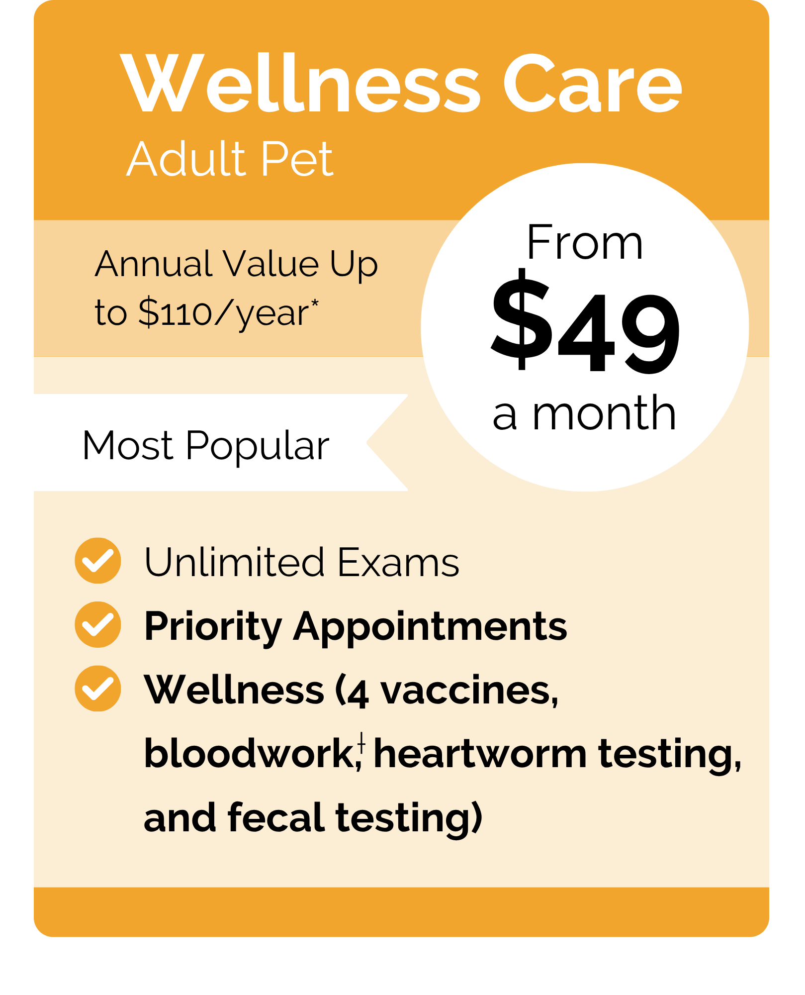 Plus, with our Wellness Care plans, you’ll enjoy priority appointments with same- or next-day scheduling whenever possible. Spread out the cost of services like dental care throughout the year, so you can give your pet the care they need without any financial stress.